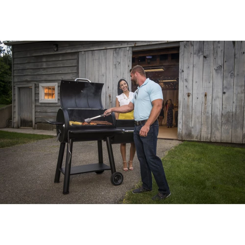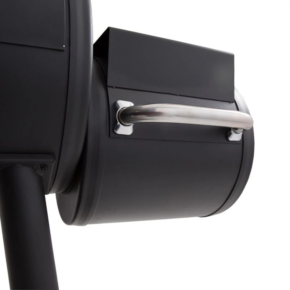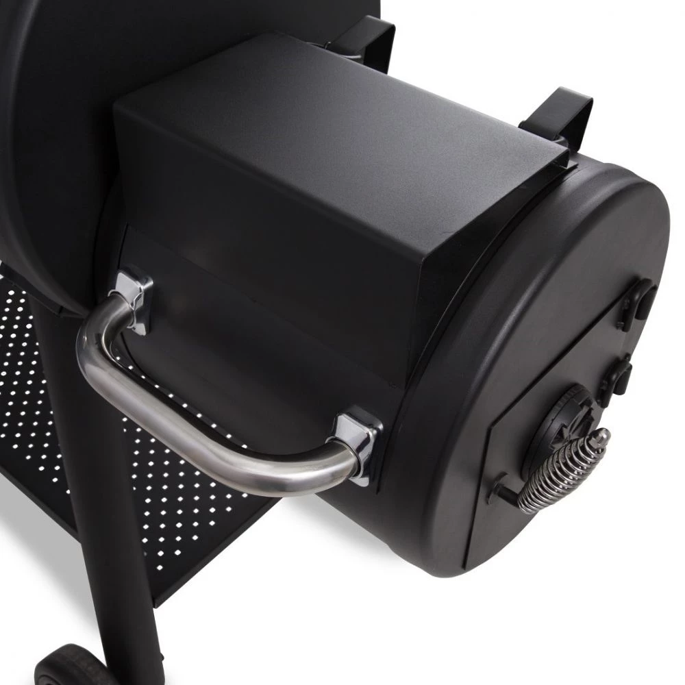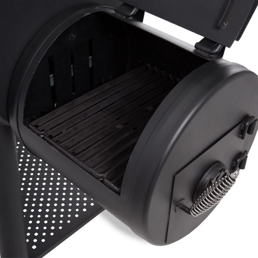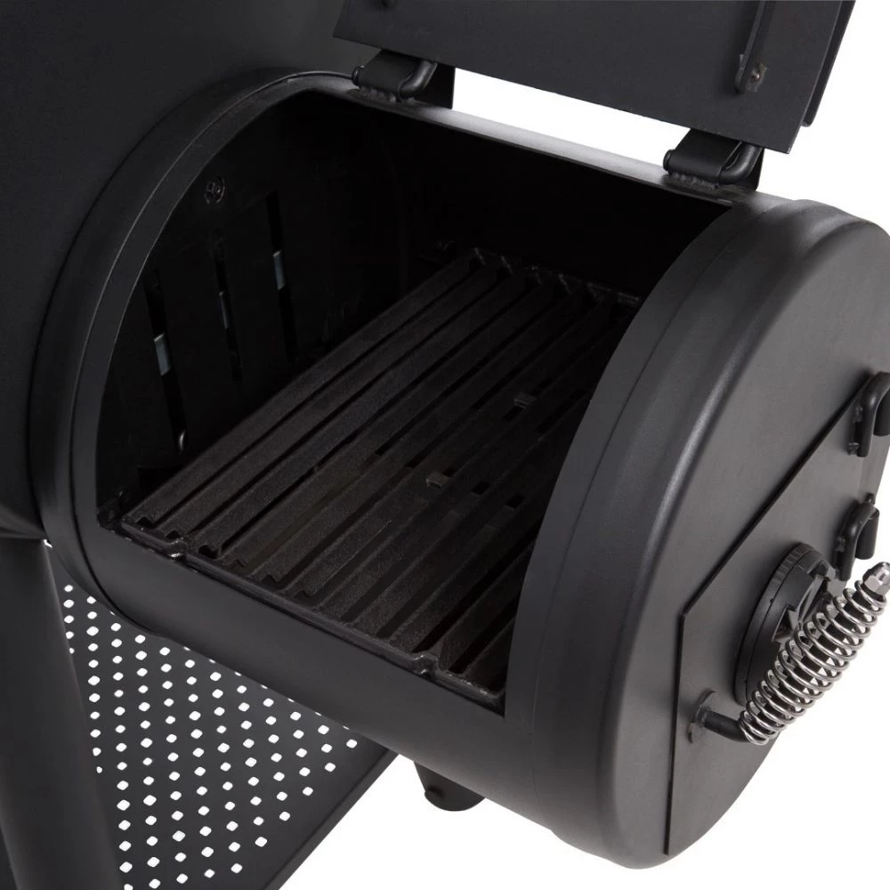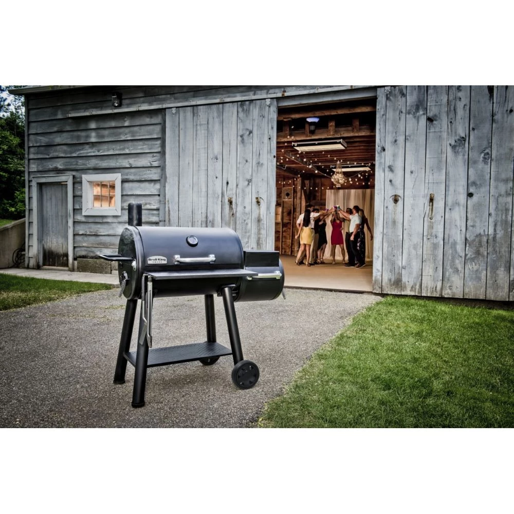 Broil King® Offsetgrill/røgovnen er fremstillet af 2 mm stål med en total grill/rygeoverflade på 6419 cm2 og kraftige, dobbeltsidede grillriste i støbejern. Ventilationssystemet omfatter en skorsten med Roto-Draft™-ventil.