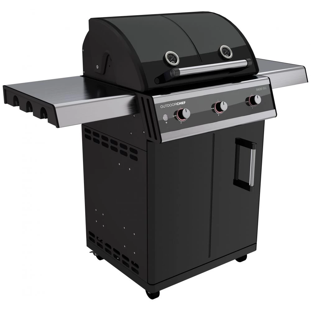 - Procelænsemaljeret gril-låg med dobbelte vægge og sidedele i støbt aluminium og 2 integrerede termometre