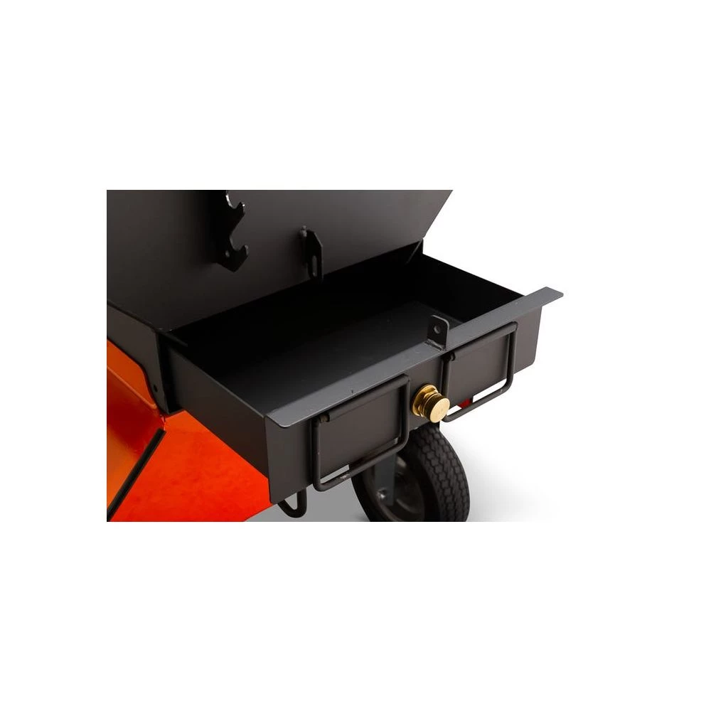 Med kraftige hængsler i rustfrit stål er grilllåget let at åbne og lukke, mens den forreste hylde i rustfrit stål giver dig al den plads, du har brug for til krydderier, værktøjer og andre genstande. Endelig har konkurrencevognen otte tommer pneumatiske dæk, der gør flytning og placering af denne grill til en leg.